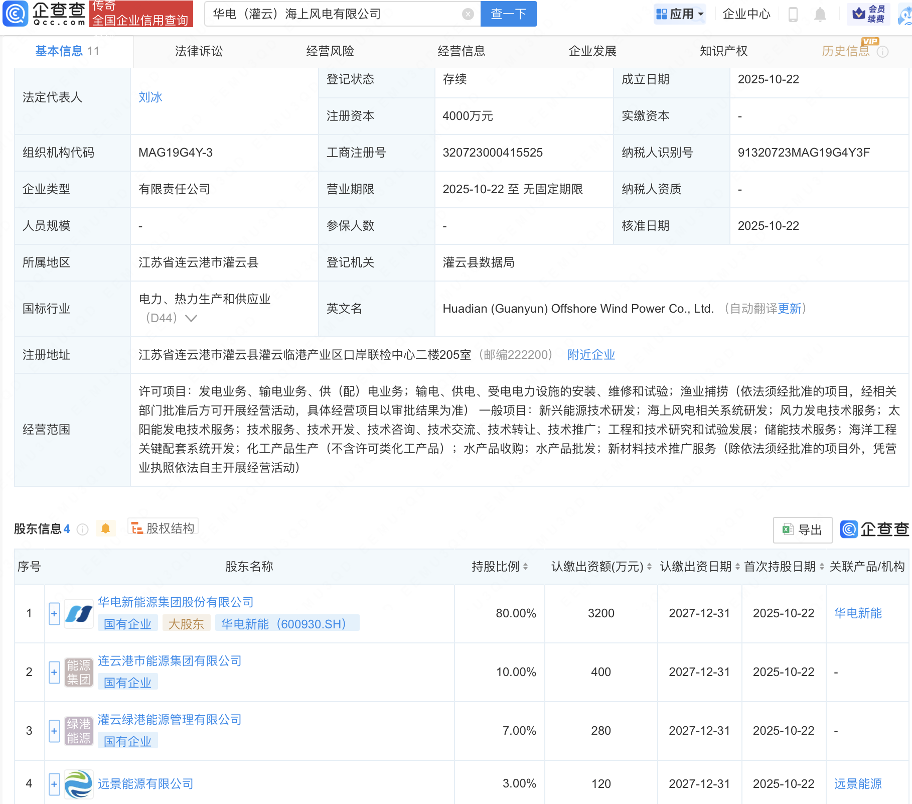 近日,华电(灌云)海上风电有限公司成立,注册资本4000万元,经营范围包含:新兴能源技术研发;海上风电相关系统研发;风力发电技术服务;太阳能发电技术服务等。企查查股权穿透显示赢金配资网,该公司由华电新能(600930)、远景能源有限公司等共同持股。
