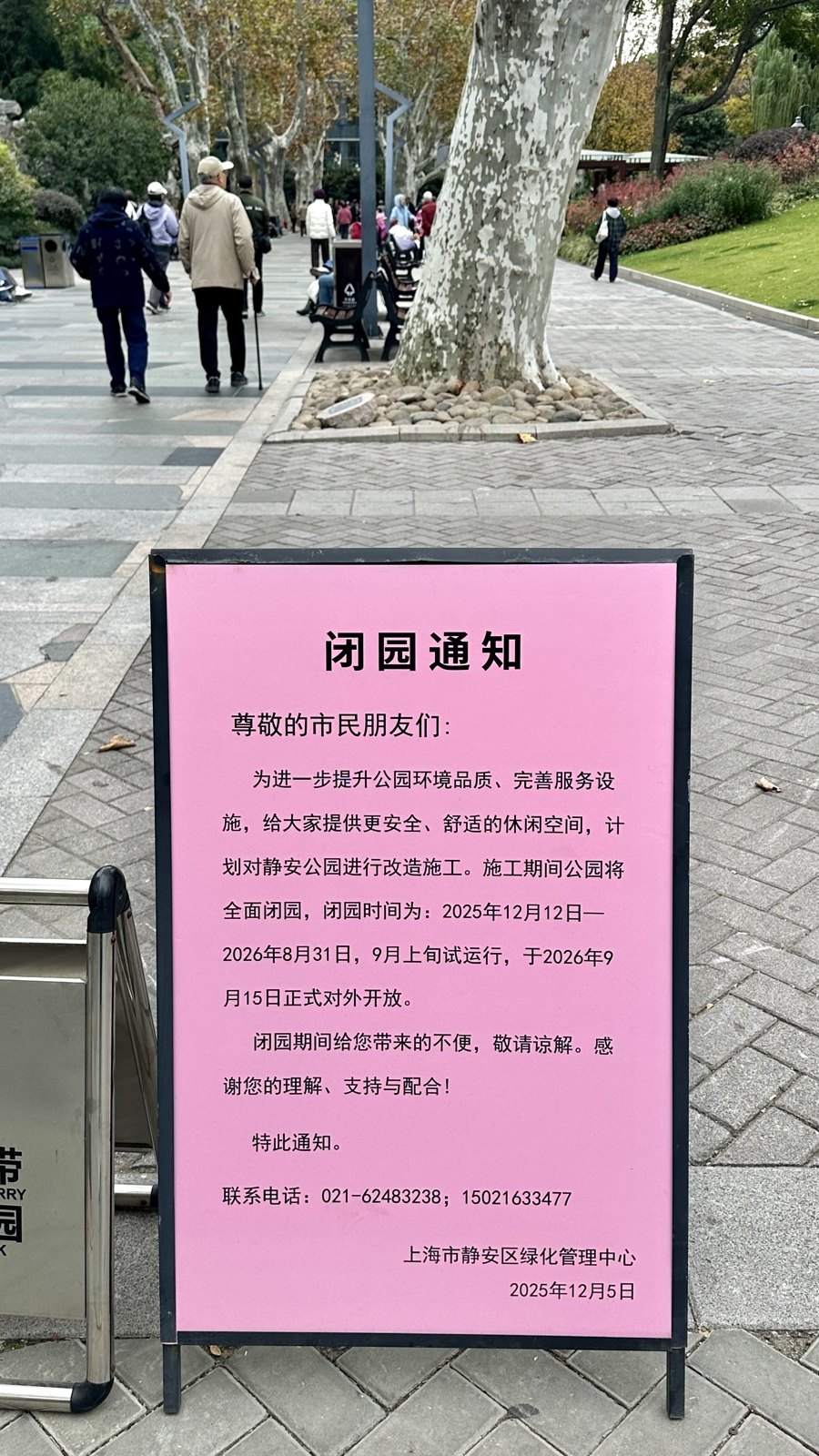 本周五起,位于市中心黄金地段的又一座老牌公园,将与市民暂别9个月。新民晚报记者从静安区绿化市容部门获悉,静安公园将于12月12日至2026年8月31日进行升级改造,预计于明年9月15日正式对外开放。升级后,静安公园将成为能代表上海海派园林的历史文化名园和南京西路“千亿商圈”的标志性典范项目。