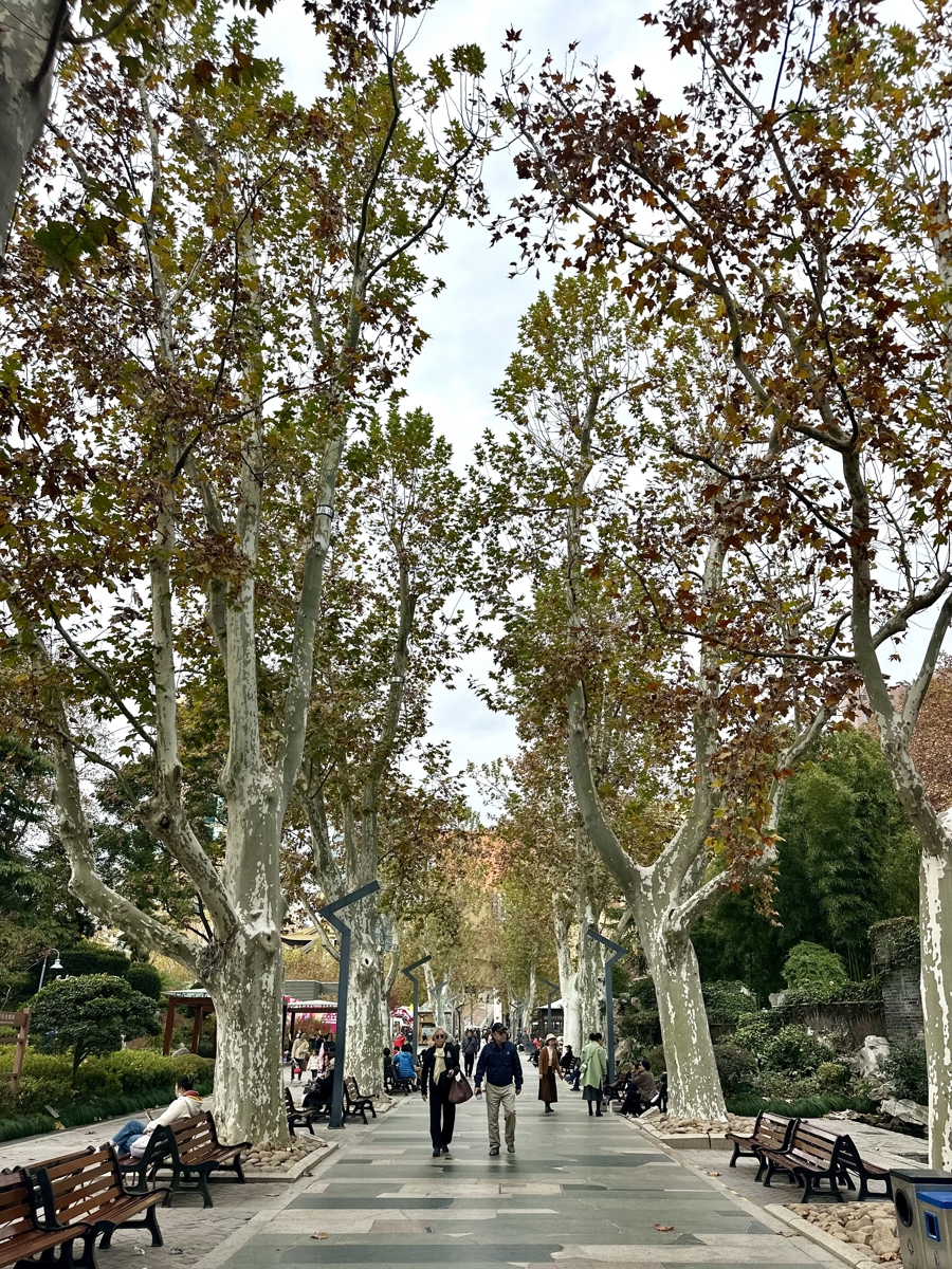 在园中,“古树大道”上的32株悬铃木是沪上最大规模的悬铃木古树群,也是“镇园之宝”。这些古树大多已超120岁,最老的栽种历史可追溯到1897年。1997年修建轨交2号线时,为了保住这片独一无二的古树群,上海选择了成本最高、难度最大、投入最多的施工方案,将车站移至南京西路,与古树群擦肩而过,还关闭了周边商业街一年,成为一段“地铁让位古树”的佳话。