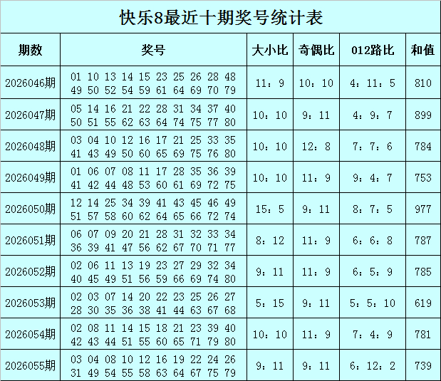 福彩快乐8第2026055期开奖回顾:03 04 08 10 12 16 19 22 24 26 31 49 54 55 58 63 64 67 75 79,其中奖号奇偶比开出9:11,大小比开出9:11,012路比开出6:12:2,和值为739,跨度为76。